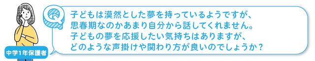 前提条件として「家族に夢や想いを話すのは恥ずかしい」という子どもの気持ちがあります。 また、保護者様は立場上、色々な場面で子どもへの注意をすることが多く、家族であるがゆえに、言葉も強くなりがちです。そのため、将来やりたい事、なりたい職業、夢については「まだわからない」「決まっていない」と答えるケースの中には、先に話した「恥ずかしい」という気持ちや、日ごろ注意をされることが多い場合は、「今のがんばりで実現できるわけがない」と否定されたり、注意されたりするきっかけになるかも、という気持ちが隠れているかもしれません。以下に挙げる内容に留意して、話をしてみるとよいと思います。